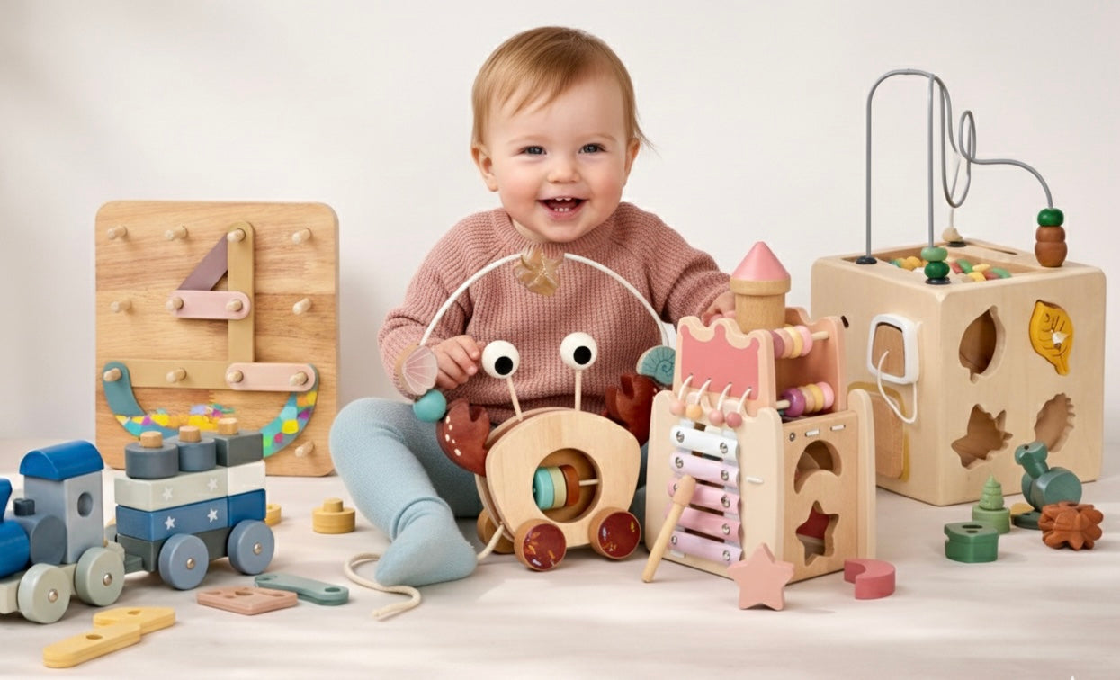 Montessori-inspireret legetøj i rolige farver og naturlige materialer – skabt til motorik, læring og tryg leg derhjemme.